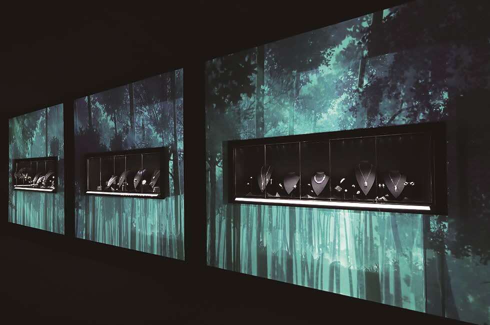 2 이번 전시에서 가장 마지막 동선에 위치한, ‘활기를 불어넣는 마법’ 방. 꽃과 곤충 모티브 등 다양한 유색석을 세팅한 입체적인 디자인의 하이 주얼리 피스들을 만나볼 수 있었다.