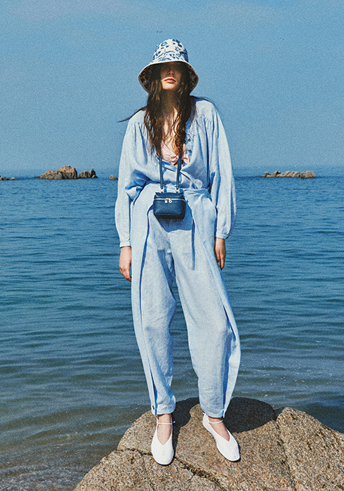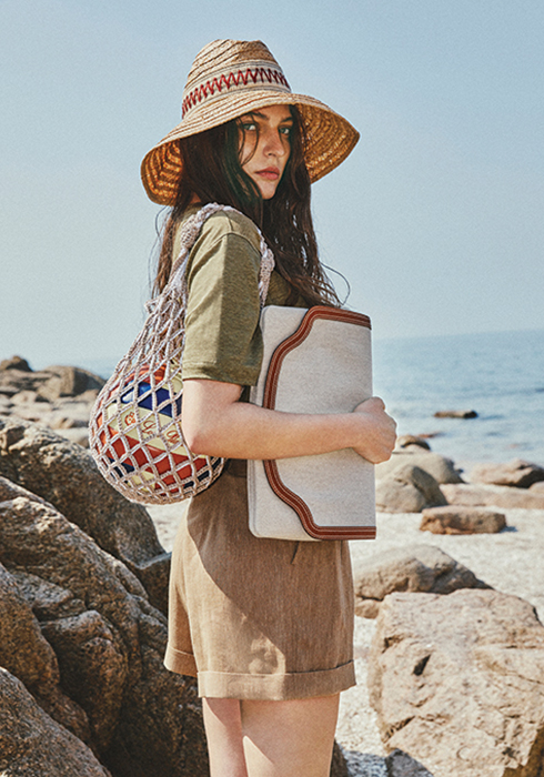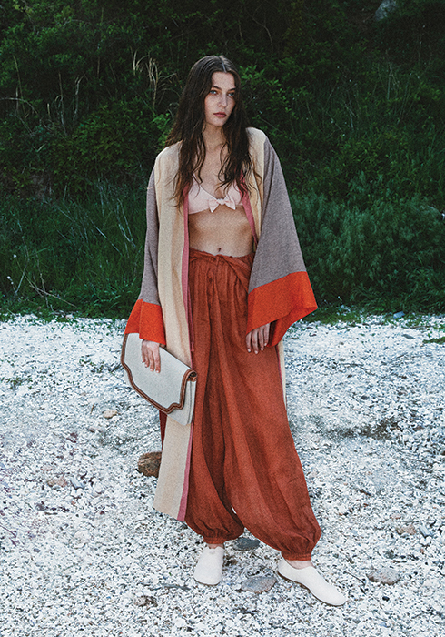 애버던 코트, 트라이앵글 비키니, 리나 점프수트, 플로티 모카신,온데 클러치 L 모두 가격 미정 로로 피아나.