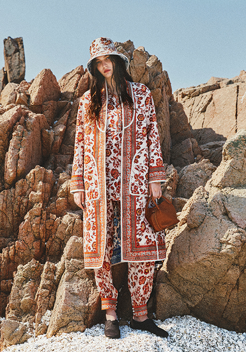플로럴 패턴의 칼리 코트, 올가 셔츠, 앨비 팬츠, 플로티 모카신, 베일 백 마이크로, 지타 피셔맨 햇 모두 가격 미정 로로 피아나.