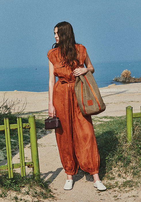 오렌지 컬러의 리나 점프수트, 플로티 모카신, 엑스트라 포켓 L19 파우치, 발리 버킷 백 L 모두 가격 미정 로로 피아나.