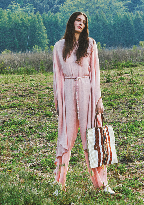 여성스러운 딜리아 점프수트, 슬리퍼 형태의 플로티 모카신, 블러썸 쇼퍼 백 모두 가격 미정 로로 피아나.