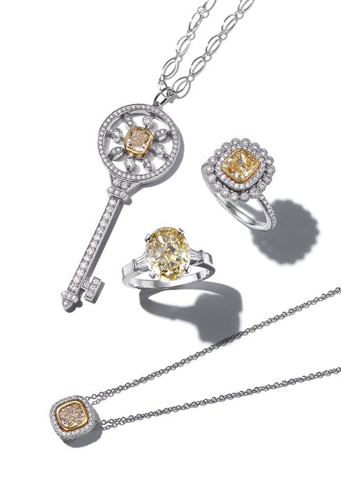 막 피어난 봄꽃과도 같이 사랑스러운 매력을 품은 인챈트 링 4천8백만원대, 플래티넘에 옐로 다이아몬드를 세팅한 칼레이도스코프 키 컬렉션 펜던트 3천3백만원대, 옐로 다이아몬드를 심플하게 세팅한 베젯 펜던트 2천4백만원대 모두 티파니. 옐로 다이아몬드를 오벌형으로 볼륨감 있게 세팅한 링 가격 미정 불가리.