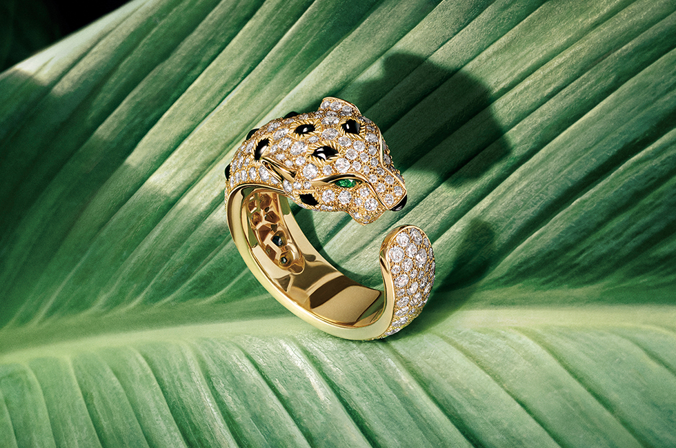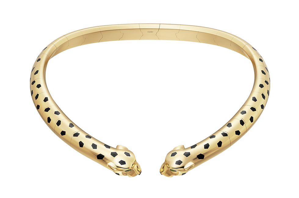 옐로 골드, 래커, 차보라이트 가넷, 오닉스로 완성한 팬더 드 까르띠에 네크리스와 브레이슬릿, 옐로 골드, 에메랄드, 오닉스, 다이아몬드 파베 세팅을 더한 팬더 드 까르띠에 링.Julien Vallon © Cartier