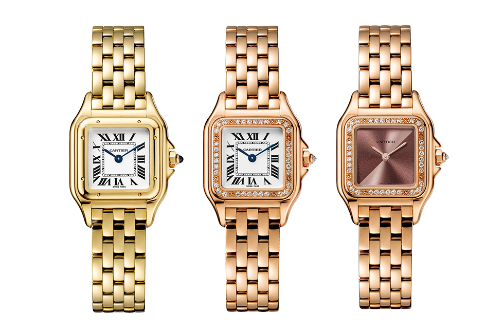 8 팬더 드 까르띠에 워치 스몰 모델. 왼쪽부터 옐로 골드에 실버 다이얼, 핑크 골드에 브릴리언트 다이아몬드를 세팅한 실버 다이얼, 브릴리언트 컷 다이아몬드를 세팅한 핑크 골드 케이스와 브레이슬릿에 골드 플럼 및 브라운 그러데이션 다이얼을 매치한 버전.