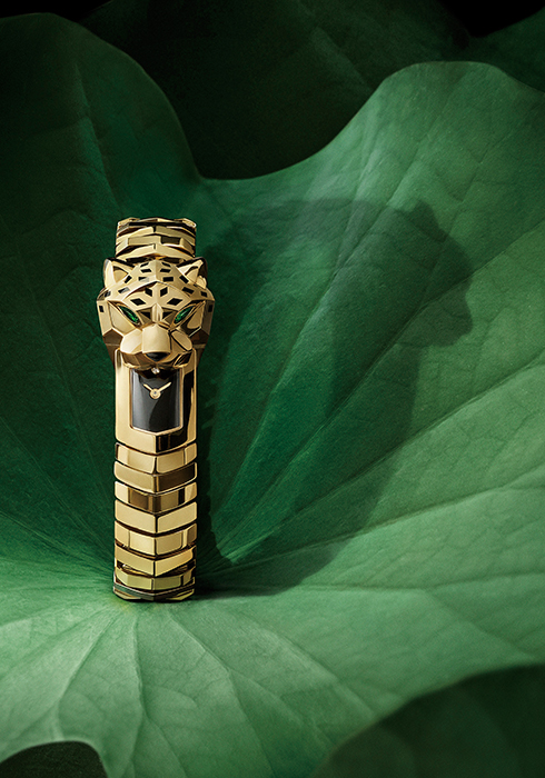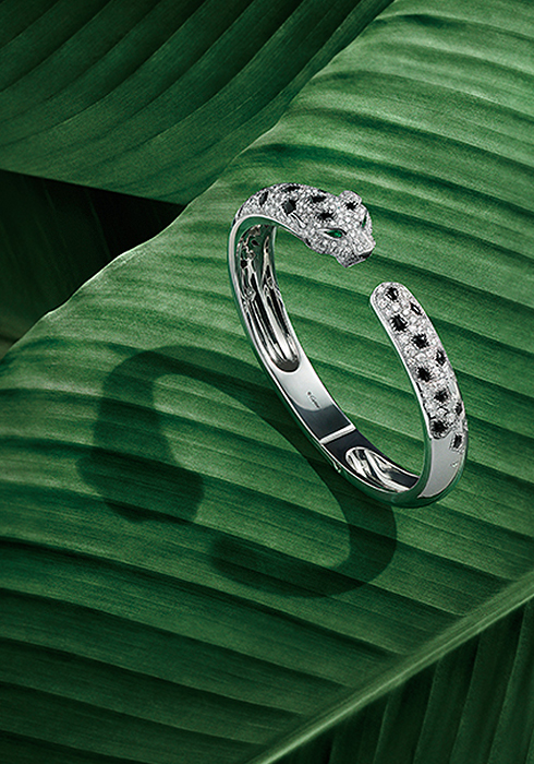 한편 작년 팬더 드 까르띠에가 또 한번 새로운 모습을 선보였다. 작년에 새롭게 론칭한 뉴 팬더 드 까르띠에는 강렬한 볼륨감이 특징이지만 놀랍도록 유연한 모습으로 놀라게 했다. 네크리스와 브레이슬릿은 겉으로 드러난 힌지 없이도 유연함을 자랑해 디자인적으로 완성도 있는 모습을 보여준다. 까르띠에가 개발한 보이지 않는 이 시스템이 컬렉션에 마법과도 같은 완성도와 매력을 더하는 것. 까르띠에의 상징적 동물인 팬더를 매력적인 곡선 디자인으로 구현한 주얼리 피스가 착용자의 몸을 완벽하게 감싸며 착용자와 마치 한 몸이 된 듯한 착용감과 연출을 선사한다. 또 간결한 라인과 디자인으로 팬더를 모던하고 아름답게 재해석한다. 팔각형 블랙 래커 스폿 및 그레이 컬러 다이아몬드를 파베 세팅하고 오닉스 스폿으로 장식한 옐로 골드 뱅글에서 이를 더욱 잘 관찰할 수 있다. 에메랄드 혹은 차보라이트로 눈을 표현한 조각 같은 2개의 팬더 머리에서 이어지는 긴 밴드는 유려한 곡선미를 자랑하며 완벽한 디자인을 이룬다.