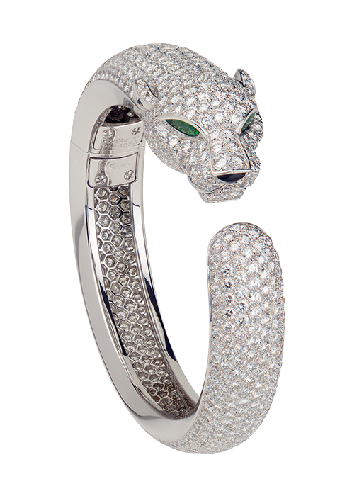 9 다이아몬드를 파베 세팅한 화이트 골드에 오닉스 스폿으로 장식한 후 에메랄드로 눈을 완성한 팬더 드 까르띠에 브레이슬릿.