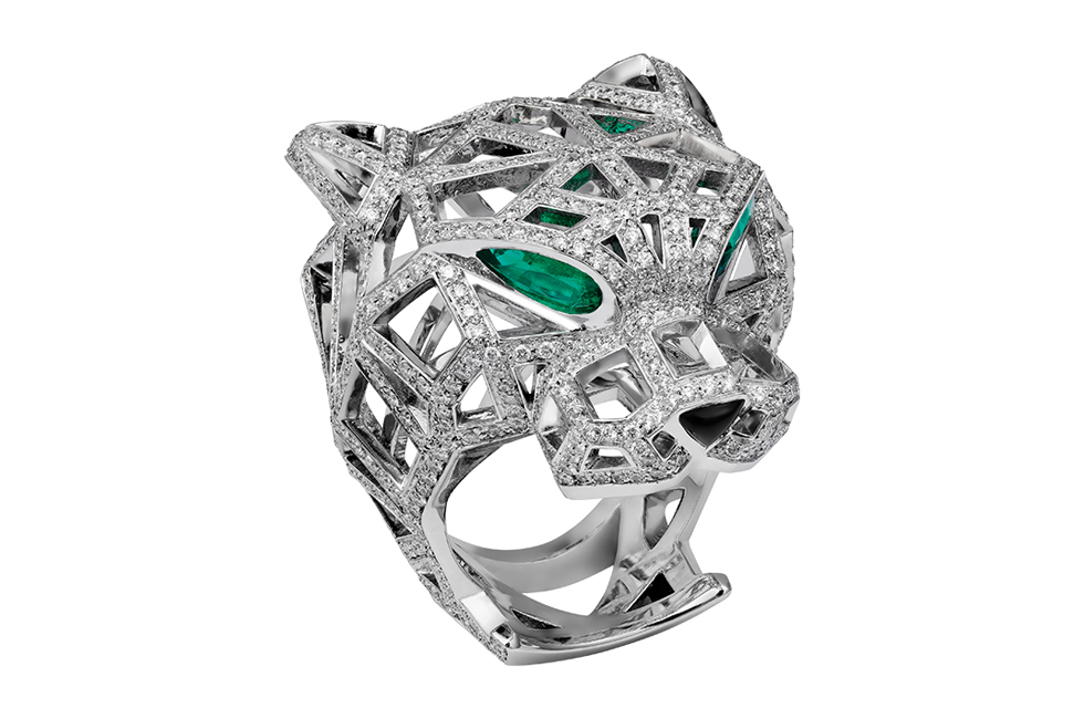 화이트 골드에 에메랄드와 오닉스, 다이아몬드 파베 세팅으로 완성한 팬더 드 까르띠에 네크리스와 링.Hugo Mapelli © Cartier