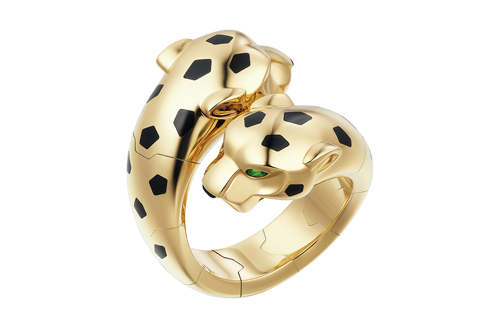4 옐로 골드, 오닉스, 에메랄드, 다이아몬드를 세팅한 까르띠에 팬더 링.