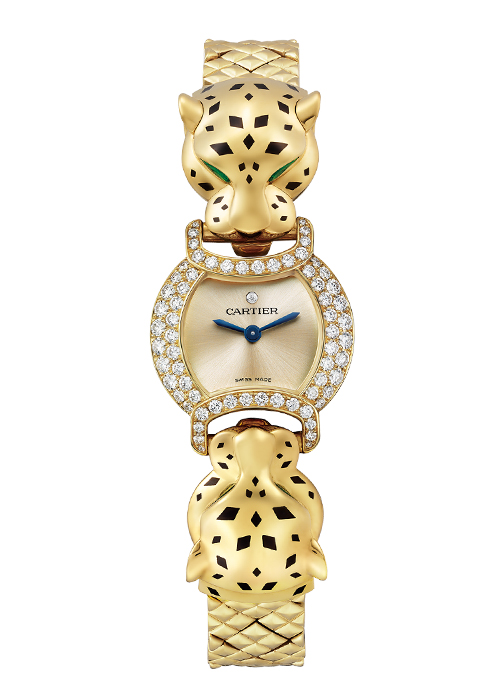 4 옐로 골드 소재 케이스와 브레이슬릿에 블랙 래커 처리한 팬더 헤드와 다이얼로 임팩트를 부여한 라 팬더 드 까르띠에 워치.