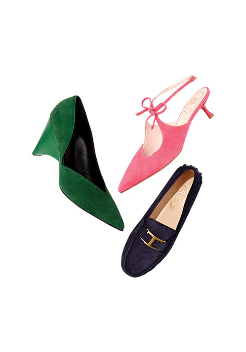 비비드한 그린 컬러로 포인트를 준 스웨이드 고트 스킨 소재의 펌프스.