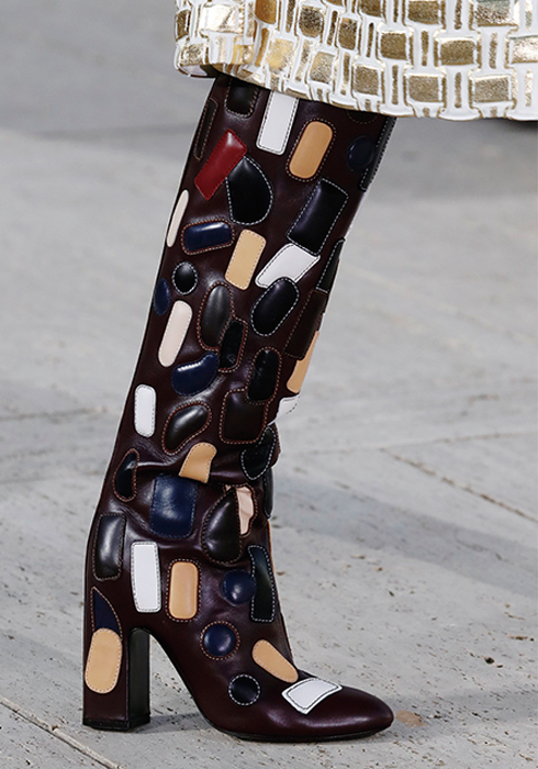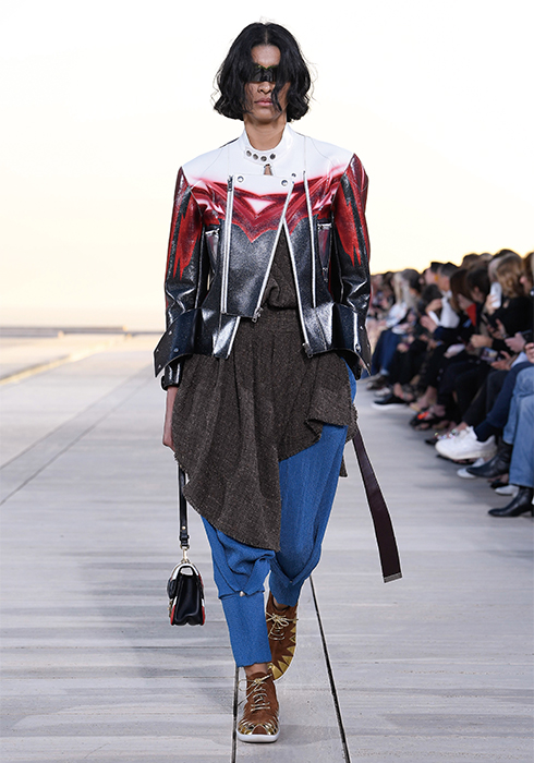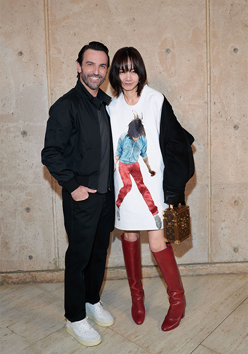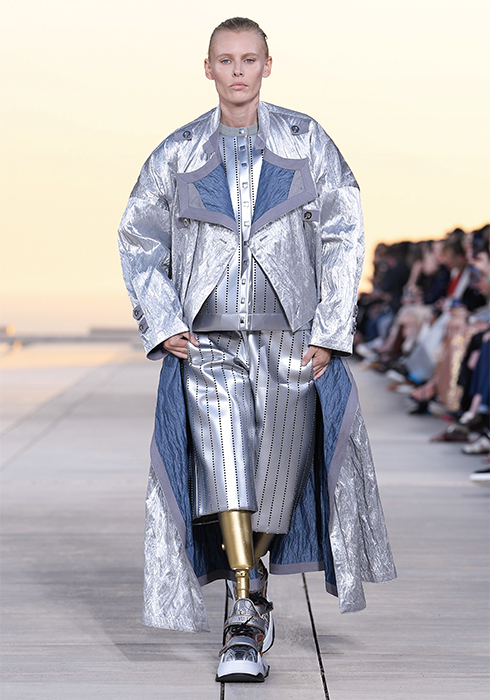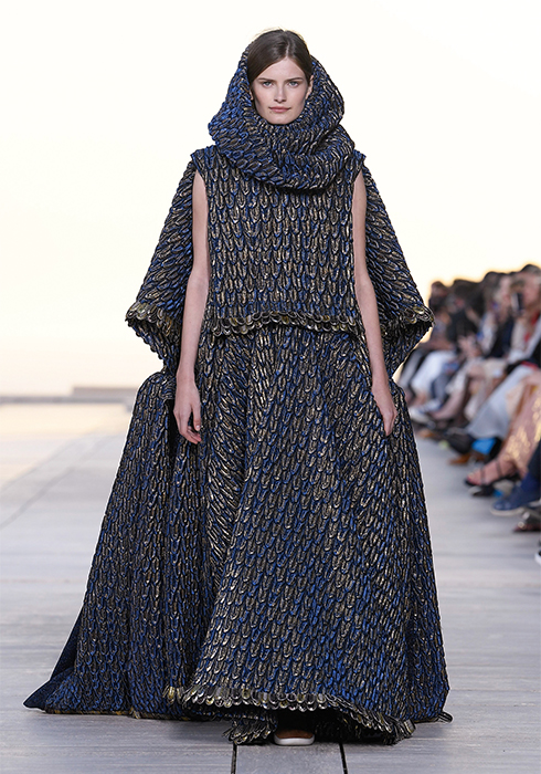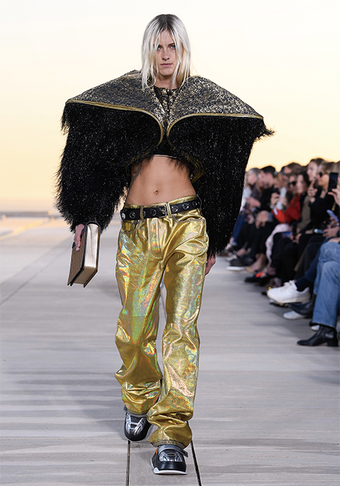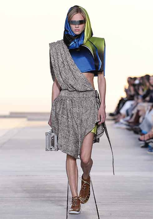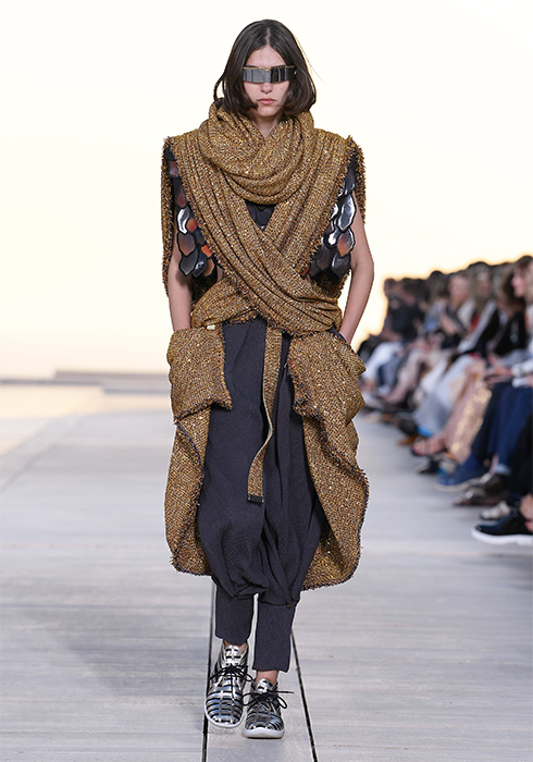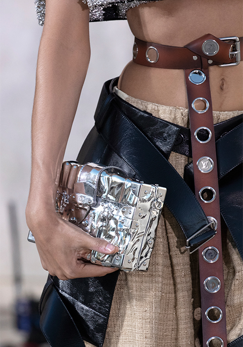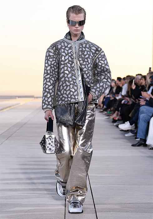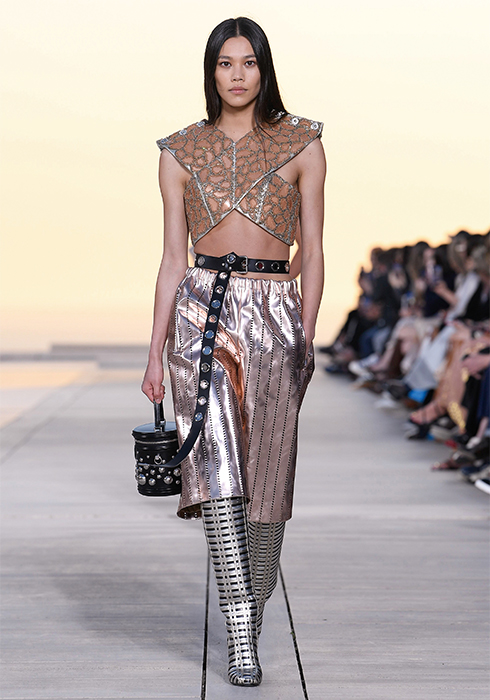 그가 선보인 의상들 역시 태양을 빼놓고는 설명할 수 없다. 니콜라 제스키에르는 옷들이 빛과 사람 사이에서 그 빛을 반사하며 존재감을 발휘하기를 원했다. 시각적인 절정으로 향하는 태양과의 조화. “이번 크루즈 쇼의 특별 게스트는 태양이다”라는 그의 말처럼 쇼의 첫 번째 파트는 강렬한 태양과 사막으로부터 자신을 보호하는 방법에 대한 것이었다. 과장된 실루엣의 구조적인 스타일과 몸을 넉넉히 감싸는 유동적이고 흐르는 듯한 실루엣이 때론 당당한 여전사, 때론 우아한 여신의 카리스마를 표현했다. 중세의 기사와 성직자를 아우르는 서사적인 스타일이라고 할까. 빛을 반사하는 색조와 장식 역시 태양을 향한 경외감을 표현했다. 금속 장식은 마치 프리즘처럼 영롱하게 빛을 반사하고, 볼레로와 같은 상의는 빛나는 날개를 연상시켰다. 또 바다, 모래, 절벽 등에서 영감받은 아름다운 프린트 의상들은 자연의 원초적인 아름다움에 기술적 요소를 가미해 독특한 시각적 효과를 발휘하며 감탄을 자아냈다. 천연 소재에 환상적인 느낌을 가미하기 위해 니콜라 제스키에르는 다양한 방법을 시도했다. 소크 연구소에서 영감받아 열화상 카메라를 이용해 찍은 사진으로 프린트를 만들어내기도 하고, 표면감을 변형해 때론 해진 듯 반들반들하게, 때론 시간이 지날수록 산화된 느낌으로 변하는 유니크한 트위드, 시퀸, 가죽, 메탈릭 데님 등을 창조해냈다. 물론 이 모든 시도가 ‘빛’을 염두에 둔 것이다. 액세서리 역시 빛으로부터 출발한 것들이 대부분이었다. 사막 부츠, 스니커즈, 뮬 형태가 섞인 하이브리드 슈즈를 선보였는데, 부츠와 신발에는 빛으로부터 에너지를 축적하는 작은 태양전지판같이 빛을 반사하는 밴드가 장식되어 있었다. 가방에 더한 금속 장식은 태양 빛 아래서 더욱 반짝이며 눈이 부시게 만들었다. 태양, 빛, 사막 지평선과 선셋으로 붉게 물든 미지의 시공간에서 잠시 태양의 유목민이 된 느낌이 들었다. 2023 루이 비통 크루즈 컬렉션은 그 어느 때보다 강렬하고 매혹적인 여정이었다.
