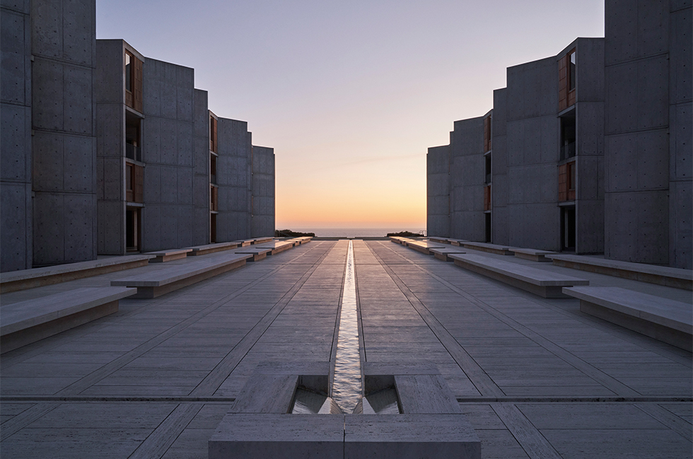 마치 시대 배경을 알 수 없는 영화의 한 장면 속에 들어와 있는 듯한, 낯설지만 아름다운 경험. 니콜라 제스키에르의 2023 루이 비통 크루즈 컬렉션은 시작되자마자 모든 관객을 압도했다. 캘리포니아 샌디에이고 라호야에 있는 소크 생물학 연구소(Salk Institute for Biological Studies)는 크루즈 쇼가 패션쇼인 동시에 건축적인 여정이길 원하는 그의 희망을 실현해준 완벽한 장소였다. 위대한 건축가 루이스 칸(Louis Kahn, 1901~1974)의 작품이자 생물 의학 연구소인 이곳은 수도원과 예술적인 휴양지가 오묘하게 결합되어 고요함과 성찰의 장소인 동시에 공상과학 소설에 나올 법한 은신처 같은 은밀함을 지니고 있다. 루이스 칸은 그의 대표작 중 하나인 이 연구소를 1965년에 완성했는데, 침묵과 빛의 건축가라는 명성답게 빛을 활용하기 위해 태양을 건물 중심에 놓았다. 일몰 시간 동안 태양은 중앙 분수의 정확한 축 안에서 완벽한 건물의 프레임을 완성한다. 햇빛과 반짝이는 물의 조합은 모든 것을 황금빛으로 물들이고, 그 빛이 닿는 모든 것은 금빛으로 변한다. 바로 이 태양의 마법에 걸리는 시간에 열린 크루즈 컬렉션을 보는 관객들은 기꺼이 그 마법 속에 빠져들 준비가 되어 있었다.