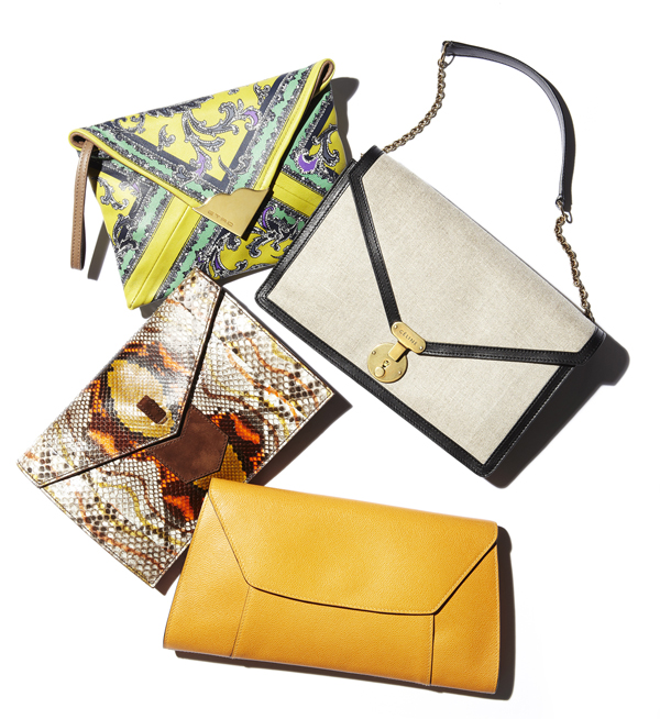 지난 시즌부터 고개를 들기 시작한 편지 봉투 모양 클러치백의 인기는 계속된다. 올봄에는 통통 튀는 밝은 컬러, 오리엔탈 프린트, 파이톤 가죽과 요란한 장식 없이 형태만을 강조한 디자인이 대거 출시된 것. 옆구리에 살짝 끼우거나 한 손으로 감싸 쥐는 세련된 애티튜드를 더하자.