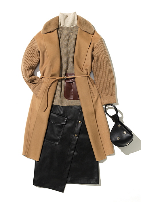 밍크 퍼 칼라와 니팅 슬리브가 감각적인 울 혼방 캐시미어 코트 만조니24 by 폼 스튜디오. 레더 아웃 포켓 장식으로 포인트를 준 슬릿 디테일 니트, 이너로 함께 레이어링한 크림색 터틀넥, 편리한 동시에 멋스러운 랩 스타일의 플랩 포켓 에코 레더 스커트 모두 에리카 카발리니 by 폼 스튜디오. 트렌디한 메탈 장식 원형 톱 핸들 백 엠마 찰스 by 폼 스튜디오.