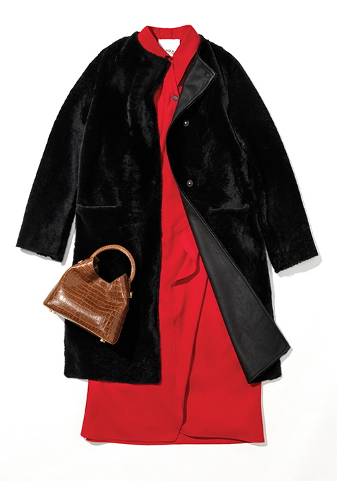 ‘메이드 인 이탈리아’ 특유의 정교한 디자인과 광택이 흐르는 고급스러운 시어링 소재의 조화가 돋보이는 노칼라 스타일의 시어링 코트 펄링 바이 지아니 피렌체 by 폼 스튜디오. 강렬한 레드 컬러의 비대칭 버튼업 롱 셔츠 드레스 에리카 카발리니 by 폼 스튜디오. 원형의 원 핸들 장식을 더한 크로커다일 프린트 소가죽 토트백 엘미 by 폼 스튜디오.