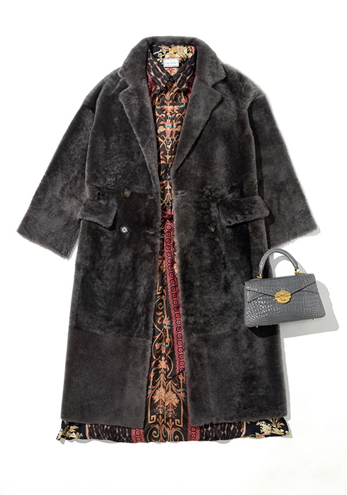 세련된 그레이 컬러와 롱 & 린 실루엣이 돋보이는 리버서블 스타일의 시어링 코트 펄링 바이 지아니 피렌체 by 폼 스튜디오. 컬러풀한 패턴을 다채롭게 믹스 매치해 포인트 아이템으로 제격인 실크 셔츠 드레스 피에르 루이스 마샤 by 폼 스튜디오. 골드 메탈 클로저로 고급스러움을 배가한 최상급 악어가죽 소재 원 핸들 토트백 바바로사 by 폼 스튜디오.