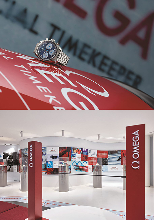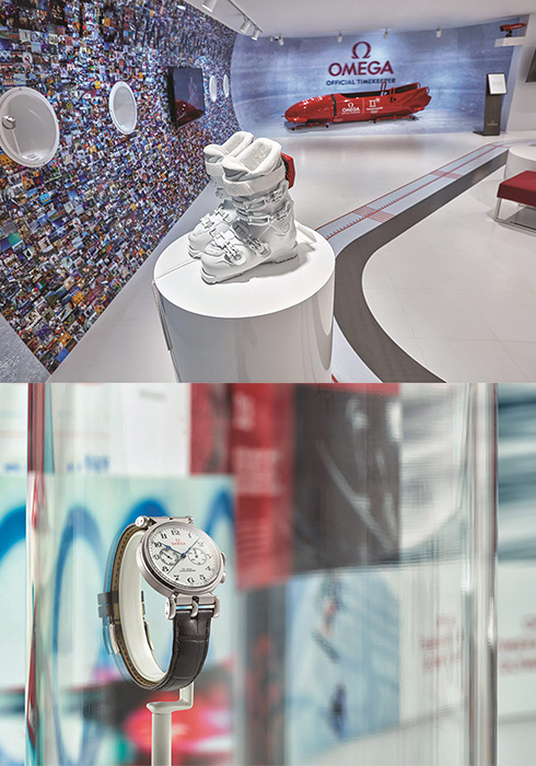 (위) 2018년 2월 9일에 열릴 2018 평창 동계올림픽을 앞두고 올림픽 공식 타임키퍼 오메가는 청담 플래그십 스토어에서 2월 말까지 올림픽 관련 전시를 개최한다. 전시된 스키 부츠의 뒷부분에 장착한 레드 컬러 장치는 2018년 평창 동계올림픽에서 신고식을 치르는 ‘스키 부츠 모션 센서’로, 이번 전시회를 통해 먼저 만나 볼 수 있다.