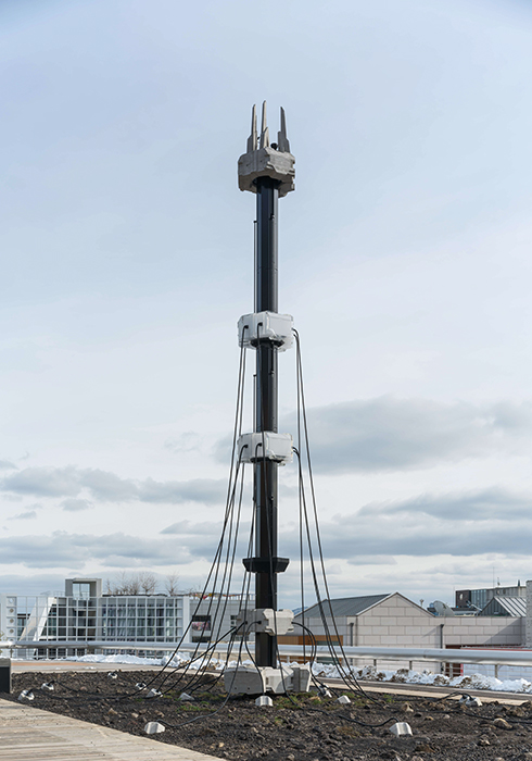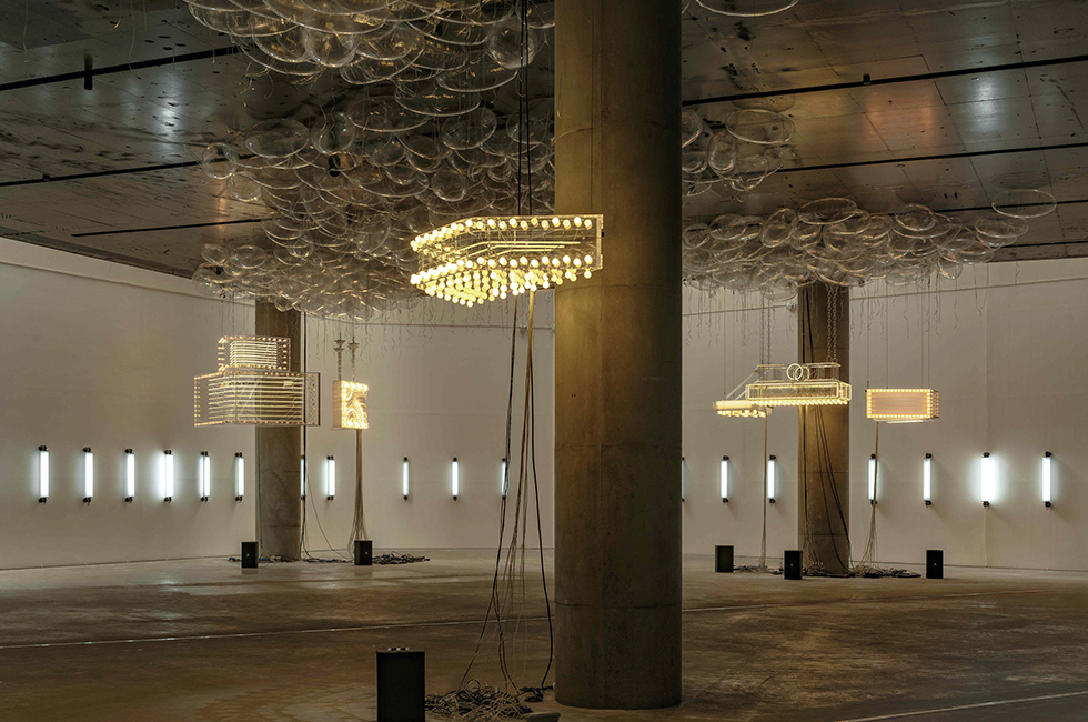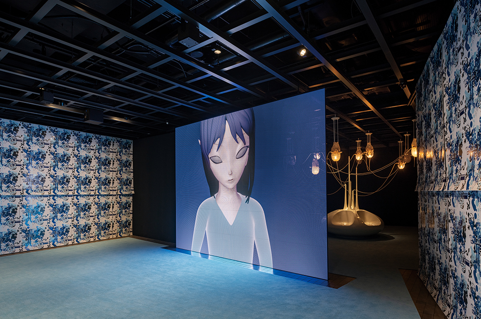 ‘아시아 최대 개인전’이라는 수식어에서 짐작할 수 있듯 미술관 내·외부 전관을 활용하는 이번 전시는 ‘밖’에서부터 시작해야 한다. 한동안 미술관의 상징처럼 자리를 지켜온 애니시 커푸어의 작품 ‘큰 나무와 눈(Tall Tree and the Eye)’ 대신 13.6m 높이의 타워가 서 있는 야외 전시 공간. 마치 놀이공원의 ‘번지드롭’같이 생긴 이 작품의 이름은 ‘막(膜)’. 이상한 소음을 내며 위아래로 움직이는 이 타워는 42개 센서로 주변의 기온, 습도, 풍량, 소리, 진동 등 환경 데이터를 수집한다. 그리고 이 데이터는 미술관 안으로 송출되어 사운드를 만들어내는 등 미술관을 살아 움직이는 듯한 유기체로 만든다. ‘막’은 작업의 소재가 되는 에너지원을 모아 미술관 내부로 공급하는 일종의 허브인 셈이다. 전시장 홀의 스크린에서 2개의 영상을 볼 수 있는데, 이 역시 타워에서 전송한 데이터로 만든 작품이다. 왼쪽에는 컴퓨터 그래픽으로 제작한 풍경 영상이 거의 정지한 듯 더디게 움직이고, 오른쪽 영상은 외부 환경 데이터를 반영해 끊임없이 변화한다. 한편 ‘막’은 미술관 지하 갤러리에도 작품의 에너지원을 보낸다. 수십 개의 말풍선이 떠 있는 공간에서 반짝이는 할로겐 전구, 규칙 없이 움직이는 벽 등 계속 변화하고 움직이는 작품 ‘차양’은 이곳이 바깥 ‘막’의 세계와 연결된 공간임을 보여준다. 필립 파레노는 이를 통해 ‘균열’을 시도했다고 말한다. “미술관은 닫혀 있는 공간이고 외부를 향해 등을 돌리고 있는 것 같습니다. 값비싼 작품을 보호하기 위해 온도와 습도까지 조절합니다. 거기에 틈을 내고 싶었습니다.” ‘보이스’라는 전시명이 말해주듯 전시장 안에는 오묘한 사운드가 끊임없이 귀를 자극한다. 작가는 이번 전시를 위해 배우 배두나의 목소리 운율을 활용해 새로운 목소리를 창조했다. 이 목소리는 동사-주어-목적어 순의 체계로 이루어진 새로운 언어 ‘∂A(델타에이)’를 습득하는데, 전시장 한편 ‘세상 밖 어디든’이란 영상 작품 속 캐릭터 ‘안리’가 배두나의 목소리로 이해할 수 없는 말을 중얼거리고, 시간이 지남에 따라 말하는 주체로 성장하는 걸 볼 수 있다. 여기에도 외부 ‘막’이 보내는 데이터가 활용된다.