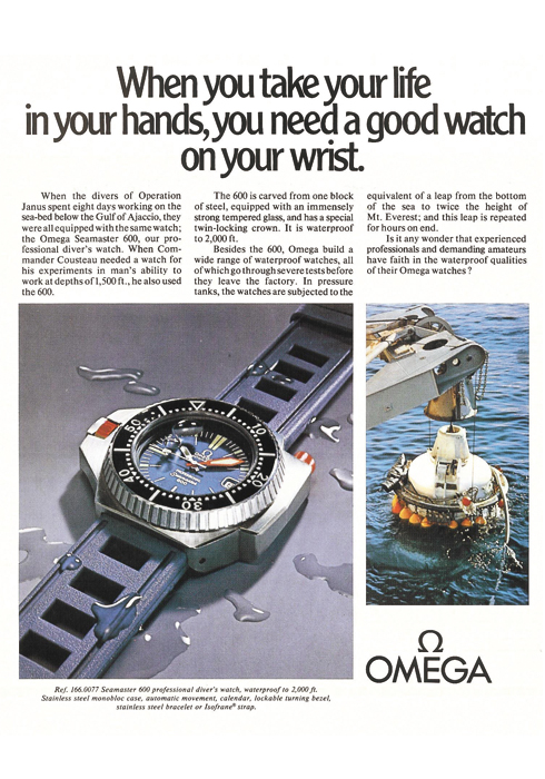 2 1970년 출시된 씨마스터 프로페셔널 600의 광고 비주얼. 목숨 걸고 일하는 사람들에게 좋은 시계가 필요하다는 슬로건이 인상적이다.
