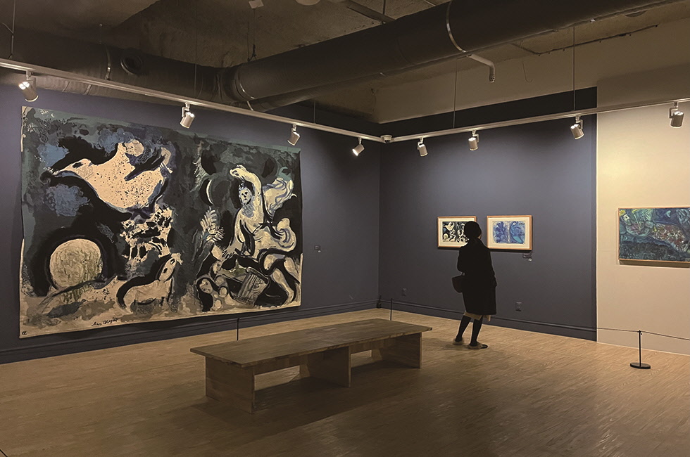 마르크 샤갈(1887~1985)은 앙드레 브르통이나 만 레이처럼 초현실주의 진영에서 활약하거나 간접적으로라도 세를 보탠 인물이 아니다. 작가 스스로도 특정 사조로 분류되는 걸 거부한 것으로 알려졌다. 그러나 꿈꾸는 듯한 세계를 표현하는 신비하고 환상적인 시각언어 덕분에 초현실주의적인 화가로 여겨지기도 한다. 현재 서울 삼성동 마이아트뮤지엄에서 진행 중인 <샤갈 특별전>은 동유럽 유대인 출신의 ‘경계인’으로서 작가의 면모를 다룬 전시라는 점에서 시선을 모은다. 물론 ‘Chagall and the Bible’이라는 부제만 보고 성서를 소재로 한 종교 전시처럼 생각할 수도 있다. 하지만 샤갈이라는 예술가의 삶과 작업에서 성서적 모티브와 신앙은 중추적이며, 단순히 종교화로 정의할 수 없다. 그가 노년기에 여생을 보낸 남프랑스에 있는 국립 샤갈 미술관을 좋은 예로 꼽을 수 있는데, 이 미술관은 ‘성서 미술관’이라고 불릴 정도로 구약성서 연작으로 채워져 있다. 러시아의 소도시 비테스크의 유대인 게토에서 태어나고 자란 샤갈에게 ‘신앙’은 아주 중요한 삶과 예술의 원천이었다. 당시 동유럽 유대인들은 도피적이고 금욕적인 거룩함을 추구하는 게 아니라 일상의 삶에 두 발을 단단히 붙인 채 현실의 기쁨을 누리는 ‘일상의 신성화’를 추구하는 하시디즘의 영향을 받았는데, 샤갈도 그러했다. 시인이기도 했던 샤갈은 성서야말로 가장 위대한 시의 원천이라고 생각했고, 구약에 담긴 많은 스토리에서 ‘인류애’를 끄집어냈다. 러시아혁명, 1, 2차 세계대전을 겪었고 자신이 가장 사랑했던 첫 부인을 잃고도 예술에 매진할 수 있었던 건 ‘열광적으로 타오르는 희망’이라는 하시디즘의 정수가 그의 기저에 자리했기 때문이기도 했을 것이다. 4m에 이르는 대형 태피스트리 작품을 비롯해 2백20여 점의 작품을 선보이는 이번 전시는 4월 10일까지.