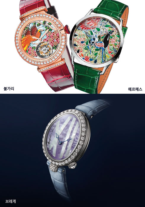 화려한 장식을 더한 여성용 오토매틱 시계가 2016 바젤월드를 풍성히 수놓았다. 먼저 브레게는 작년에 선보인 레인 드 네이플 프린세스 미니 버전을 새 단장했는데, 기존 화이트 머더오프펄 다이얼을 라벤더 색상으로 물들인 것이 가장 큰 변화다. 여기에 베젤과 러그에 브릴리언트 컷 다이아몬드를 세팅, 이전과는 확실히 차별될 정도로 더욱 화려해진 것이 특징. ‘레인 드 네이플 프린세스 미니 9818’ 워치는 칼리버 586/1 무브먼트를 장착해 38시간의 파워 리저브를 자랑한다. 예술적인 장식에 공을 들인 제품도 많았다. 불가리는 ‘예술가의 정원’이라는 테마 아래 지상 낙원의 모습을 다이얼에 담아낸 ‘루체아 일 지아르디노 파라디소’로 시선을 모았다. 투르비용 칼리버 BVL 263을 탑재한 이 워치는 청명한 하늘을 표현한 것 같은 블루 머더오브펄 다이얼과 장인이 직접 손으로 페인팅해 완성한 새, 무성한 이파리와 꽃, 그리고 6시 방향에 위치한 투르비용까지 한 폭의 그림처럼 잘 어우러진 모습이 인상적이다. 올해 에르메스에서 소개한 ‘슬림 데르메스 밀 플뢰르 드 멕시끄’도 마찬가지. 15~16세기 태피스트리에서 착안한 문양을 자개 다이얼에 그려 넣고, 장인의 정교한 손동작으로 무려 20겹이 넘는 붓칠과 90℃가 넘는 가마에 굽기를 여러 번 반복해 완성했다. 미묘한 생동감이 느껴질 만큼 높은 완성도를 자랑하는 이 시계는 에르메스 매뉴팩처 H1950 울트라 씬 무브먼트로 움직인다.