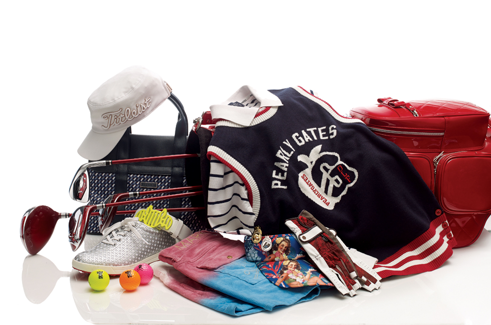 볼륨감 있는 자수 로고 디테일이 포인트인 화이트 모자 6만8천원 타이틀리스트. 잔잔하게 프린트한 기하학 패턴이 돋보이는 토트백. 37X26cm, 18만원 엘로드. 한국 여성 골퍼에게 최적화한 드로우 스핀 헤드로 슬라이스 회전을 억제하고, 오로치 샤프트로 큰 비거리를 실현하는 라루즈 드라이버 70만원, 핫 메탈 소재를 사용한 고반발 페이스와 크리스털 셰이프 구조로 큰 비거리와 타구감을 자랑하는 라루즈 아이언 1백80만원, 사랑스러운 리본 장식과 퀼팅 패턴을 더한 레드 캐디 백 89X33cm, 가격 미정 모두 미즈노. 스트라이프 피케 티셔츠 23만8천원, 젊은 감성이 느껴지는 네이비 로고 베스트 27만8천원 모두 파리 게이츠. 나뭇잎 패턴의 메시 장갑 8만원 엘로드. 하와이언 걸 프린트로 경쾌한 트로피컬 무드가 느껴지는 선 바이저 12만8천원, (모자 위) 해골 모티브의 볼 마커 각 5만8천원, 포켓에 수놓은 해골 자수와 핑크 & 블루 그러데이션 컬러가 멋스러운 스커트 33만8천원, ‘Golf or Die(골프 아니면 죽음)’라는 위트 있는 메시지를 새긴 네온 컬러 골프공 3개입, 2만8천원 모두 마크앤로나. 가볍고 편안한 착용감을 자랑하는 실버 패턴의 스파크리스 골프화 가격 미정 엘로드. 네온 컬러의 악마 모티브가 개성 있는 화이트 벨트 14만원 왁.