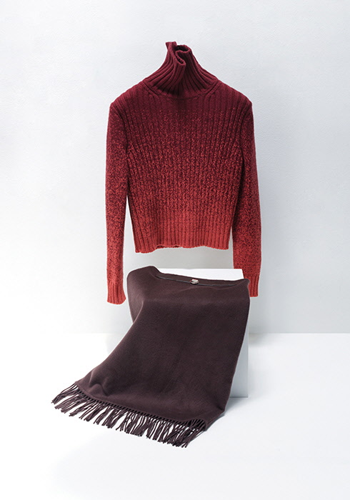 레드 컬러 그러데이션이 멋스럽고 도톰한 소재로 보온성이 뛰어난 터틀넥 티셔츠 2백40만원대 로로피아나. 문의 02-546-0615