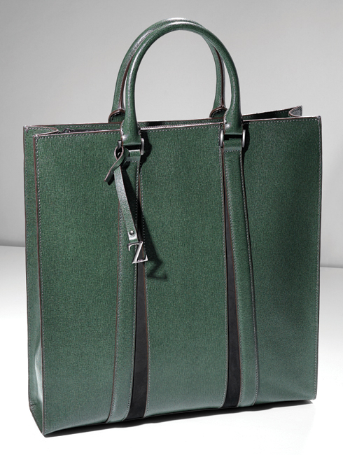 가죽의 결이 살아 있는 사피아노 소재의 다크 그린 컬러 토트백. 가방 전면의 독특한 패턴과 브랜드의 아이덴티티를 강조한 이니셜 참 장식, 견고한 사각 형태로 비즈니스맨에게 추천한다. 37X38.5cm 1백만원대.