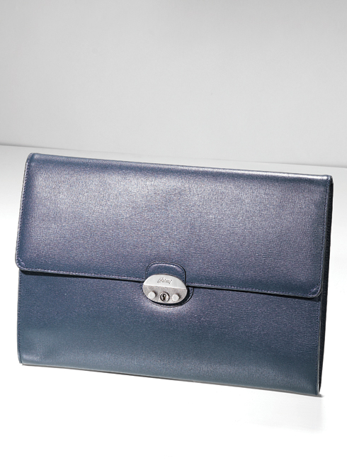 톤 다운된 블루 컬러 송아지가죽의 미니멀한 형태가 돋보이는 스퀘어 클러치백. 가방 전면의 심플한 버클 장식만으로 세련된 멋을 드러냈다. 클래식한 수트를 모던하게 변신시켜줄 아이템. 36X26cm 4백80만원.
