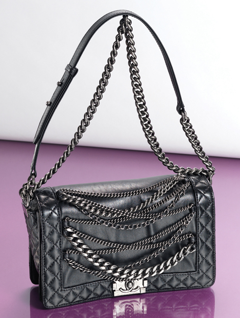 이번 시즌 런웨이에서 선보인 록 스피릿의 부츠 디테일을 보이 샤넬 백에 옮겨왔다. 유연한 카프 스킨에 다양한 체인 장식을 가방 전면의 디테일로 사용해 강렬한 느낌을 준다. 28X18cm 가격 미정.