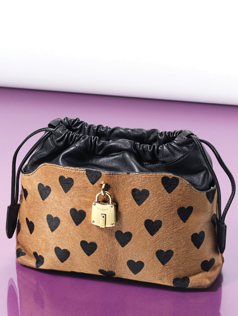 핸드백을 자연스럽게 움켜잡거나 ‘반하다’라는 이중적인 의미를 담은 크러시 백. 송치와 카프 레더 소재의 매치와 자물쇠 장식, 위트 있는 하트 프린트가 특징이다. 27X23cm 1백95만원.