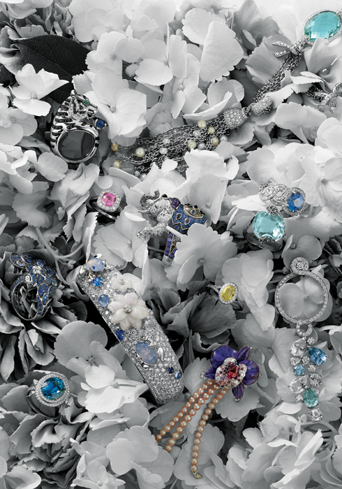 화이트 플라워를 열면 시계 다이얼을 볼 수 있는 로맨틱한 플라워 모티브 하이 주얼리 시크릿 워치. 화이트 골드에 다이아몬드, 제이드, 칼세도니, 사파이어, 문스톤을 자유롭게 배치했다. 가격 미정 까르띠에.