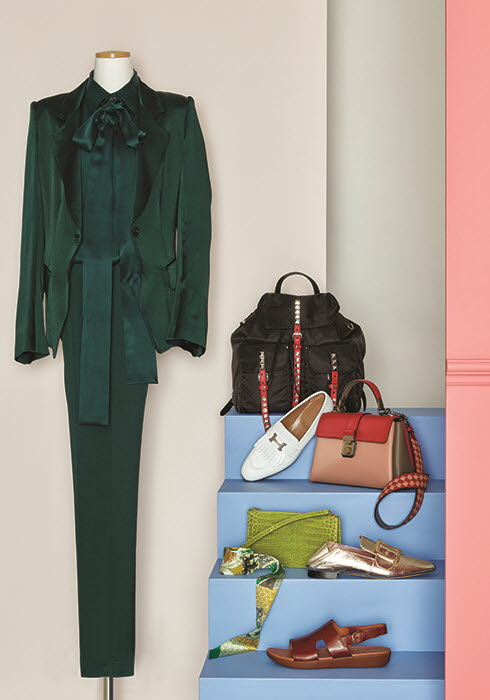 트윌리 스카프 20만원대 에르메스. 그린 악어가죽 클러치 백. 27X18.5cm, 3백28만원 콜롬보 비아 델라 스피가. 골드 컬러 로퍼 89만원 발리. 브라운 가죽 샌들 21만9천원 핏플랍. |