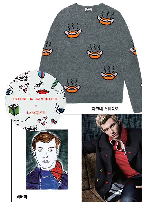 이모티콘 캐릭터부터 증강 현실의 아이콘 포켓몬까지, 그래픽 요소는 우리의 일상을 파고들고 있다. 물론 패션계도 예외가 아니다. 먼저, 이 귀여운 움직임에 동참한 아크네 스튜디오는 요즘 현대인들의 삶에서 빼놓을 수 없는 이모티콘(emoji)에서 영감을 받은 캡슐 컬렉션을 선보였다. 표정 있는 얼굴처럼 생긴 사각형 패치뿐 아니라 도넛과 바나나 등의 모티브를 스웨트셔츠와 티셔츠, 모자, 스니커즈 등에 상징적으로 표현한 것. 이렇게 직접적인 그림을 패션에 녹여내기보단, 다른 방식으로 풀어낸 브랜드도 있다. 트렌치코트의 대명사이자 영국 패션을 대표하는 버버리가 대표적인 예. 다양한 방식과 디지털 플랫폼을 활용해 매번 새롭고 혁신적인 모습을 선보이는 버버리에서 세계적인 일러스트레이터 루크 에드워드 홀(Luke Edward Hall)과 협업해 2016 F/W 광고 캠페인을 구성한 것. 그는 이번 시즌 키 백인 다양한 소재로 완성된 ‘패치워크 백’을 보다 사실적으로 묘사하기 위해 워터컬러, 분필, 오일 파스텔 등 다양한 재료로 표현한 작품을 선보였다. 그런가 하면, 소니아 리키엘은 뷰티 브랜드 랑콤과의 협업 소식을 알렸다. 평소 소니아 리키엘에서 자주 다루던 팝 컬러 스트라이프 패턴과 파리지엔의 일상을 귀여운 일러스트로 랑콤의 뷰티 제품 케이스에 그대로 녹여낸 것. 이처럼 어른들의 동심 판타지를 충족시킬 캐릭터의 열풍이 얼마나 거세질지 다음 행보가 자못 궁금해진다.