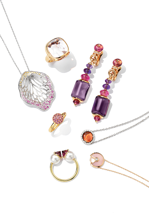 나뭇잎 모양에 옐로와 핑크 스톤을 세팅한 페탈 네크리스 6백만원대 타사키. 핑크 컬러 유색석을 볼드하게 세팅한 쥬레 링 2백만원대 루시에. 핑크 골드에 탁티 컷 애미시스트와 루벨라이트, 다이아몬드를 세팅한 무사 컬렉션 이어링 2천8백만원대 불가리. 플랫 컷 가닛의 자연스러운 아름다움이 돋보이는 콜포 디 풀미네 가닛 펜던트 3백만원대 포멜라또. 핑크 컬러 오팔과 작은 다이아몬드를 세팅한 아뮬레뜨 드 까르띠에 브레이슬릿 2백만원대 까르띠에. 레드 컬러 가닛을 세팅한 리파인드 리벨리온 가닛 링 2백만원대 타사키. 핑크 컬러 스톤을 화려하게 세팅한 뮤르 링 2백만원대 루시에.