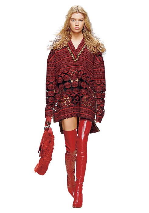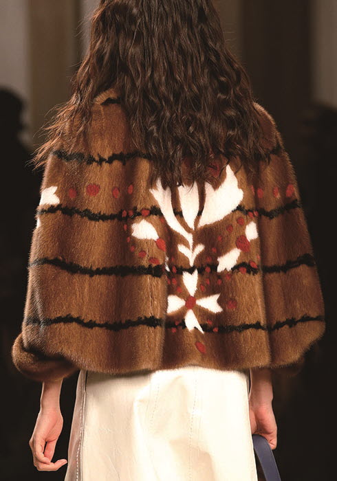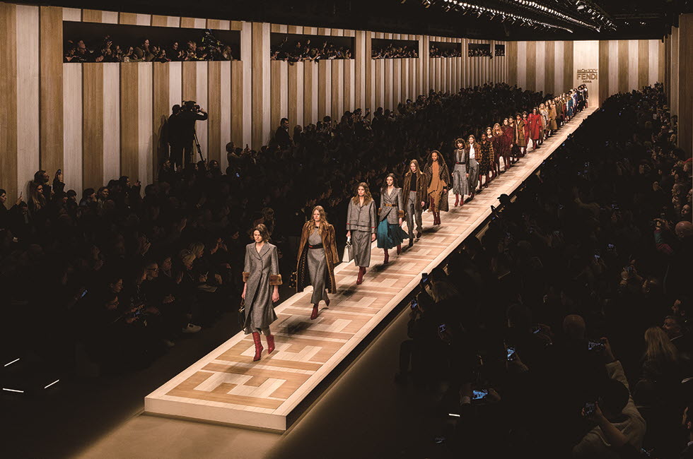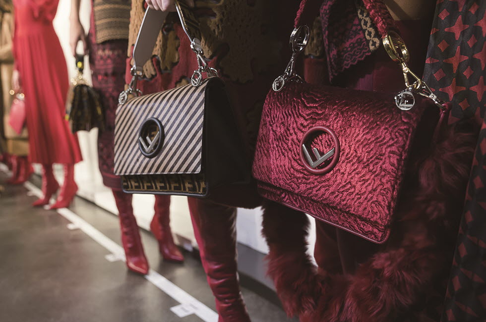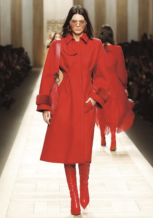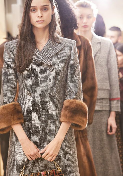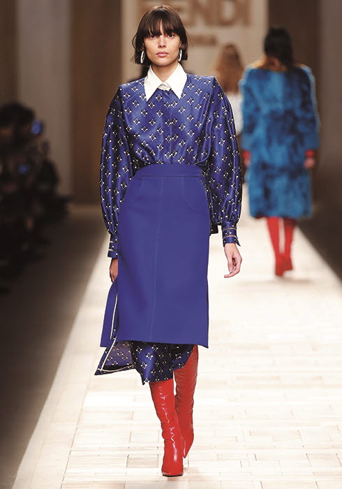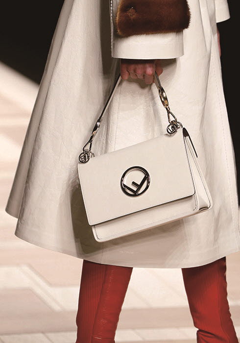 펜디의 2017년 F/W 여성 컬렉션은 밍크로 소매 단을 감싼 회색 헤링본 더블브레스트 코트로 시작되었다. 코트의 어깨는 각이 졌고 허리는 가늘게 재단해 클래식한 분위기를 자아냈지만, 결코 구식처럼 보인다거나 지루하지 않았다. 모델이 빨갛게 반짝이는 페이턴트 부츠를 신고 있었기 때문. 무엇보다 부츠의 컬러, 봉투를 밀봉할 때 사용하는 봉랍인 ‘체랄라카’의 빨간색이 컬렉션을 온통 물들였다. 이는 1950년대 레이디라이크 룩에 관능미와 더불어 현대적인 분위기를 덧입힌 반전의 장치였다. 전통과 현대의 장점만 취해 새로움을 창조하는 펜디의 정신이 올가을에도 발현된 것이다. 칼 라거펠트는 이른 새벽, 로마의 거리를 서성이는 영화 속 여인을 뮤즈로 자유로운 영혼을 표현하고 싶어 했다. 그래서 착안한 것이 오스트리아 빈의 목판인쇄와 18세기 이탈리아 포장지에 대한 오래된 책인 〈파피에르스 도미노테스(Papiers Dominote′s)>다. 니트 조직을 컷아웃 기법으로 오려내고, 모피를 인레이 기법으로 잘라냈으며, 실크 위에 아칸서스 잎사귀를 프린트하는 등 여러 가지 수공예적인 모자이크가 컬렉션을 창의적으로 완성했다. 정교하게 구축한 기하학적 무늬를 남성 수트에서 기인한 헤링본과 프린스 오브 웨일스 체크, 오피스 룩으로 제격인 포멀한 아이템에 적용해 영화적인 분위기에 장식적이고 현대적인 면모가 드리웠다. 이번 2017 F/W 컬렉션에도 펜디는 가방 라인을 더욱 견고하게 다졌다. 더블 핸들 박스 백 ‘런어웨이’와 ‘트리플렛’을  처음 선보인 것. ‘런어웨이’는 큼직한 사첼 백처럼 보이는 고전적인 가방이지만 사다리꼴로 형태를 변화시키고 가방 테두리를 검은색으로 트리밍해 현대적인 감각을 적용했다. ‘트리플렛’은 F 로고 한 글자로 구성된 모노그램 고리에 세 가지 크기의 파우치가 달린 작은 가방이라 간편하고 실용적이다. 펜디의 또 다른 잇 백인 ‘캔아이’에도 트리플렛의 주요 특징인 원형 로고를 적용해 새로움을 불어넣었다. 그렇다면 기존의 더블 F 로고는? 물론 여전히 건재하다. 독특한 기법으로 벨벳 소재의 가방에 안착했으니, 새로운 버전이 또 하나 늘어난 셈이다.
