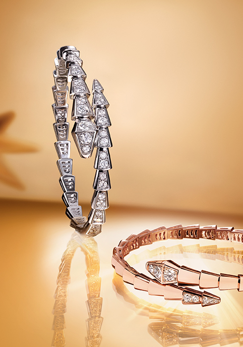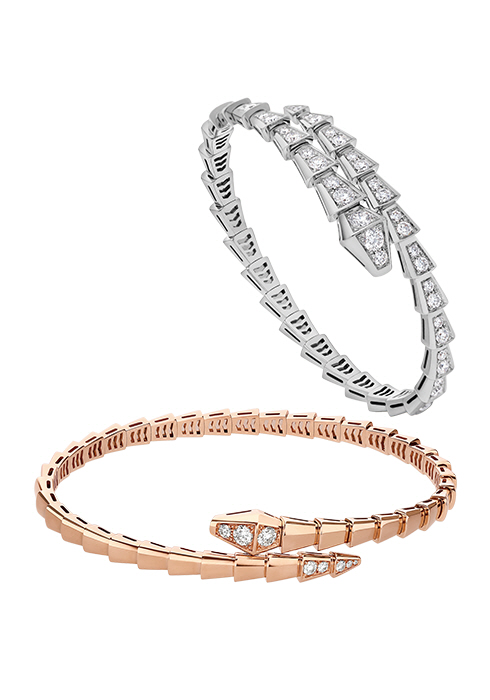 화이트 골드에 다이아몬드를 풀 파베 세팅한 세르펜티 브레이슬릿 4천9백20만원, 로즈 골드에 다이아몬드를 데미 파베 세팅한 세르펜티 브레이슬릿 1천4백60만원 모두 불가리.