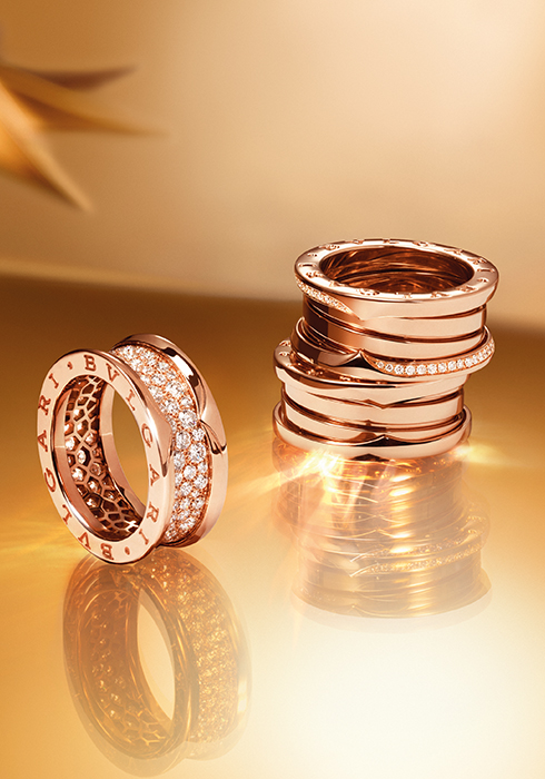 (왼쪽부터 시계 방향으로) 로즈 골드에 다이아몬드를 파베 세팅한 비제로원 링 2천9백90만원, 로즈 골드에 다이아몬드를 한 줄 파베 세팅한 비제로원 링 6백95만원, 로즈 골드 비제로원 링 3백90만원 모두 불가리.