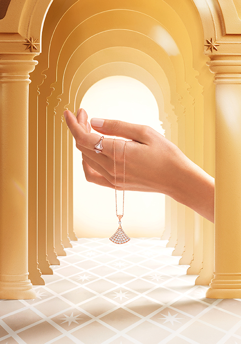 로즈 골드에 머더오브펄과 다이아몬드를 매치한 디바스 드림 링 5백35만원, 로즈 골드에 다이아몬드를 세팅한 디바스 드림 네크리스 3천3백30만원 모두 불가리.
