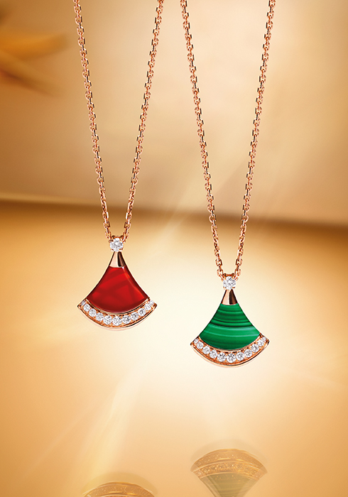로즈 골드에 레드 커닐리언과 다이아몬드를 매치한 디바스 드림 네크리스 5백35만원, 로즈 골드에 그린 말라카이트와 다이아몬드를 세팅한 디바스 드림 네크리스 5백45만원 모두 불가리.