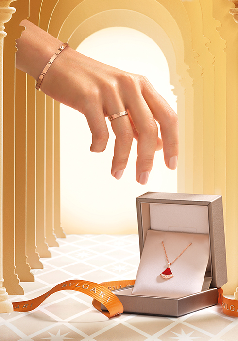 로즈 골드 비제로원 브레이슬릿 5백85만원, 비제로원 링 1백65만원, 로즈 골드에 커닐리언과 다이아몬드를 매치한 디바스 드림 네크리스 5백35만원 모두 불가리.