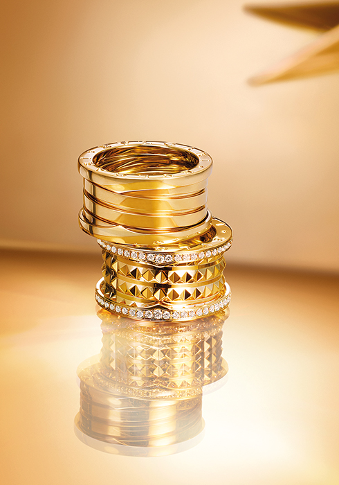 옐로 골드 비제로원 링 4백48만원, 옐로 골드에 다이아몬드를 세팅한 비제로원 링 1천4백80만원 모두 불가리.