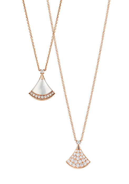 로즈 골드에 다이아몬드와 머더오브펄을 더한 디바스 드림 네크리스 5백5만원, 로즈 골드에 다이아몬드를 파베 세팅한 디바스 드림 네크리스 9백35만원 모두 불가리.