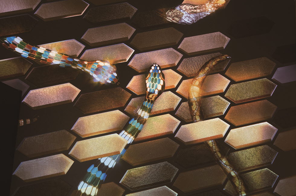 2 전시장 벽면에 설치한, 뱀의 육각형 비늘을 형상화한 강렬한 미디어 디스플레이.