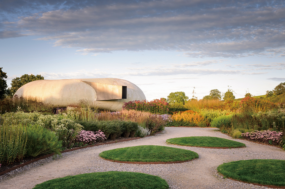 우선 갤러리 부지에 들어서면 시선을 압도적으로 잡아끄는 하얀색 대형 조각 ‘The Arch’(1963/69). 6m 넘는 높이의 거대한 조각이 자아내는 오라를 느끼며 갤러리 건물 안으로 들어서면 5개의 전시실에 걸쳐 60년 넘는 작가의 커리어를 수놓은 다양한 작품이 관객을 맞이한다. 신석기시대의 거석기념물로 유네스코 세계문화유산에 등재된 스톤헨지(브루턴에서 자동차로 1시간 내 거리에 있다)에서 영감을 받았다는 무어의 스케치와 석판화부터 청동, 섬유유리, 돌 등 다양한 소재의 크고 작은 조각 작품들, 그리고 이번 전시에 직접 참여한 작가의 딸 메리 무어(Mary Moore)가 부친과의 추억에 얽힌 오브제 등 각종 소장품을 모아놓은 정감 어린 섹션까지…. 사실 헨리 무어는 갤러리 소속 작가가 아니지만 하우저앤워스는 이렇듯 경계를 넘는 다채로운 방식의 협업을 기꺼이 시도해왔다(이곳에 머무는 레지던시 작가 역시 마찬가지로, 하우저앤워스 소속일 필요는 없다). 이렇게 갤러리 내부 투어를 마치면 숨을 한 차례 들이켜고 마음을 다잡아야 할 필요가 있을지도 모른다. 갤러리 건물과 서점 등으로 둘러싸인 안쪽 뜰을 통과해 다시 밖으로 향하면 명성 자자한 ‘아우돌프 가든(Oudolf Field)’이 무어의 야외 조각전과 함께 기다리고 있어서다. 네덜란드 조경 디자이너 피트 아우돌프(Piet Oudolf)의 솜씨로 여러해살이식물이 저마다의 맵시를 뽐내며 자연스럽고도 묘한 조화를 발하는 이 실외 정원이 아주 완만한 경사를 타면서 길게 펼쳐지는 풍경은, 그야말로 환상적이지만 결코 요란스럽지 않다. 먼 길을 찾아온 바쁜 여행자에게도 잠시 속도를 늦추고 쉬어 가라고 등을 토닥여주는 듯한 포근함이 깃들어 있다. 정원 산책길 끝에는 칠레 건축가 스미한 라딕(Smijan Radic´)의 타원형 파빌리온이 다정한 휴식처가 되어주고 있기도 하다. 아트 토크 등 각종 프로그램을 진행하는 다목적 공간으로 쓰이지만 비어 있을 땐 아이들이 숨바꼭질을 하는 놀이터도 된다.