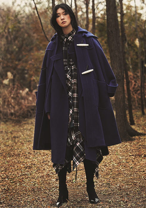 커팅 디테일의 블루 코트 가격 미정 포츠 1961. 체크 셔츠와 스커트 모두 가격 미정 사카이. 블랙 롱부츠 가격 미정 스튜어트 와이츠먼. |