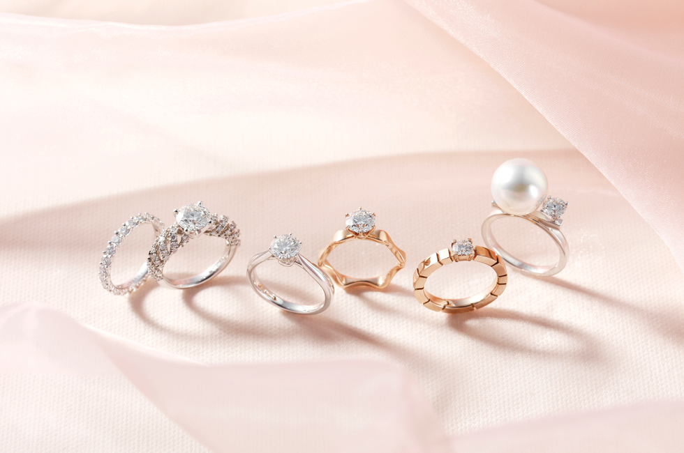 1 (왼쪽부터) 최상급 멜리 다이아몬드를 세팅해 화려한 브릴란테 가드 링, 화려하게 세공한 밴드에 1.5캐럿 다이아몬드를 세팅한 바운드 솔리테어 링, 심플하고 단순하지만 최고의 세팅력으로 소장 가치가 높은 피아체레 1캐럿 다이아몬드 솔리테어 링, 부드러운 곡선의 꽃잎을 연상케 하는 1캐럿 다이아몬드를 세팅한 라벨로 링, 피아노 건반처럼 디자인한 사쿠라골드(SAKURAGOLD) 컬러의 밴드에 0.3캐럿 다이아몬드를 세팅한 피아노 솔리테어 링, 최상급 12mm 남양진주에 0.5캐럿 다이아몬드를 세팅해 타사키 고유의 매력을 느낄 수 있는 밸런스 클래스 링 모두 타사키.