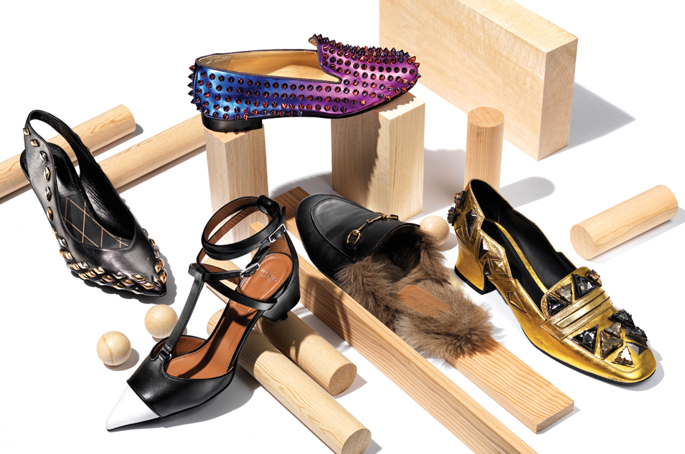 실버, 브론즈, 골드 스터드 장식으로 화려하게 포인트를 준 골드러쉬 슬링백 펌프스 1백50만원대 루이 비통. 뾰족한 스터드 장식이 강렬한 투톤 컬러의 페이턴트 슈즈 2백7만원 크리스찬 루부탱. 딥한 컬러감의 스와로브스키 장식이 돋보이는 골드 컬러 펌프스 2백만원대 보테가 베네타. 기존의 시그너처 로퍼를 슬리퍼로 재해석하고 캥거루 퍼로 위트를 더한 홀스빗 로퍼 슬리퍼 87만원 구찌. 관능적인 스트랩 장식과 섹시한 앞코가 매력적인 슈즈 1백53만원 지방시.