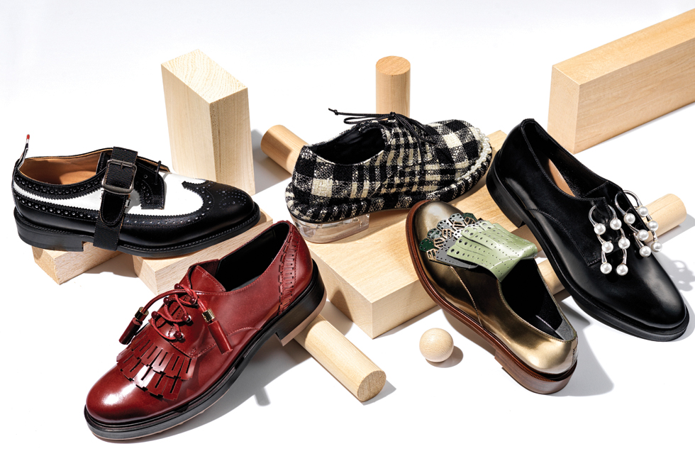 그래픽적으로 커팅한 프린지와 태슬 장식, 트레킹화에서 볼법한 레이스업 디테일까지 개성이 돋보이는 레드 컬러 레이스업 로퍼 95만원 토즈. 발등을 감싸는 스트랩 장식이 눈에 띄는 블랙 & 화이트 윙 팁 슈즈 1백95만원 톰 브라운. 앞코의 여성스러운 진주 장식과 깅엄 패턴의 트위드 소재가 눈길을 사로잡는 레이스업 슈즈 1백65만원 시몬 로샤 by 분더샵. 발걸음을 옮길 때마다 리듬감 있게 움직이는 진주 링으로 화려하게 장식한 블랙 로퍼 89만원 콜리악 by 분더샵. 다양한 컬러와 펀칭 디테일로 포인트를 준 브론즈 컬러 로퍼 69만원 로베르 끌레제리 by 마이분.