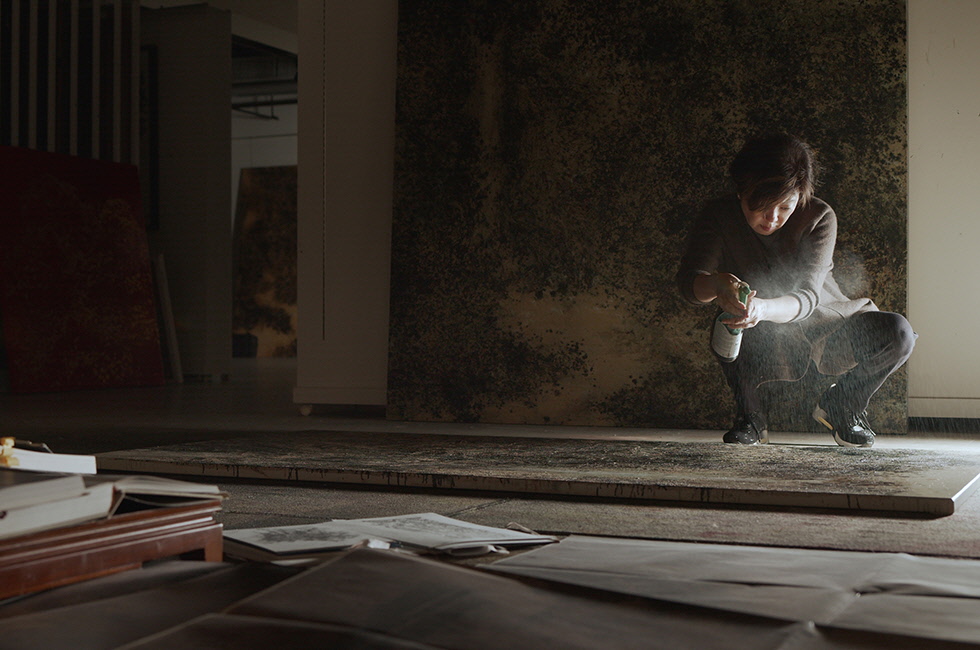 이렇듯 불교 수행 방식을 따르는 작품 철학을 바탕으로 하지만 소피 창의 작품 내용과 형식을 보노라면 동서양을 자유로이 오간다. 동양 산수화의 기법에 캔버스, 아크릴, 오일 등 서양 재료를 접목해 독창적인 화면을 창조한다. 이를테면 먹과 한지를 유화와 캔버스로 대체하고 아크릴과 아교를 섞고 금박을 콜라주하는 식이다. 동시에 전통 기법을 적극 활용하기도 하는데, 그중 핵심 기법은 ‘지묵법(漬墨法)’이다. 먹의 수성에 따라 스며드는 특성을 강조하는 이 기법을 통해 자연의 역동성과 생동하는 듯 강한 에너지를 표현한다. “전통 중국화 이념에서의 ‘기운생동(氣韻生動)’ 에너지를 표현하기 위해 지묵법을 차용하게 됐죠. 제 작업 과정에서 ‘기’는 붓의 속도감, ‘운’은 전체 화면의 리듬이라면, ‘생’은 화면 공간의 확장인 생장(生長)이라 할 수 있습니다. ‘동’은 바로 생동하는 에너지의 표현으로 작품을 제작하는 행위와도 같아요.”